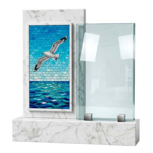 Изящный и одухотворенный монумент, выполненный в лучших традициях классической архитектуры. Использование белоснежного мрамора в сочетании с небесно-голубой мозаикой и прозрачным стеклом создает атмосферу умиротворения и чистоты. Композиция символизирует свободу души и вечный покой, где парящая над морем чайка становится центральным художественным образом.